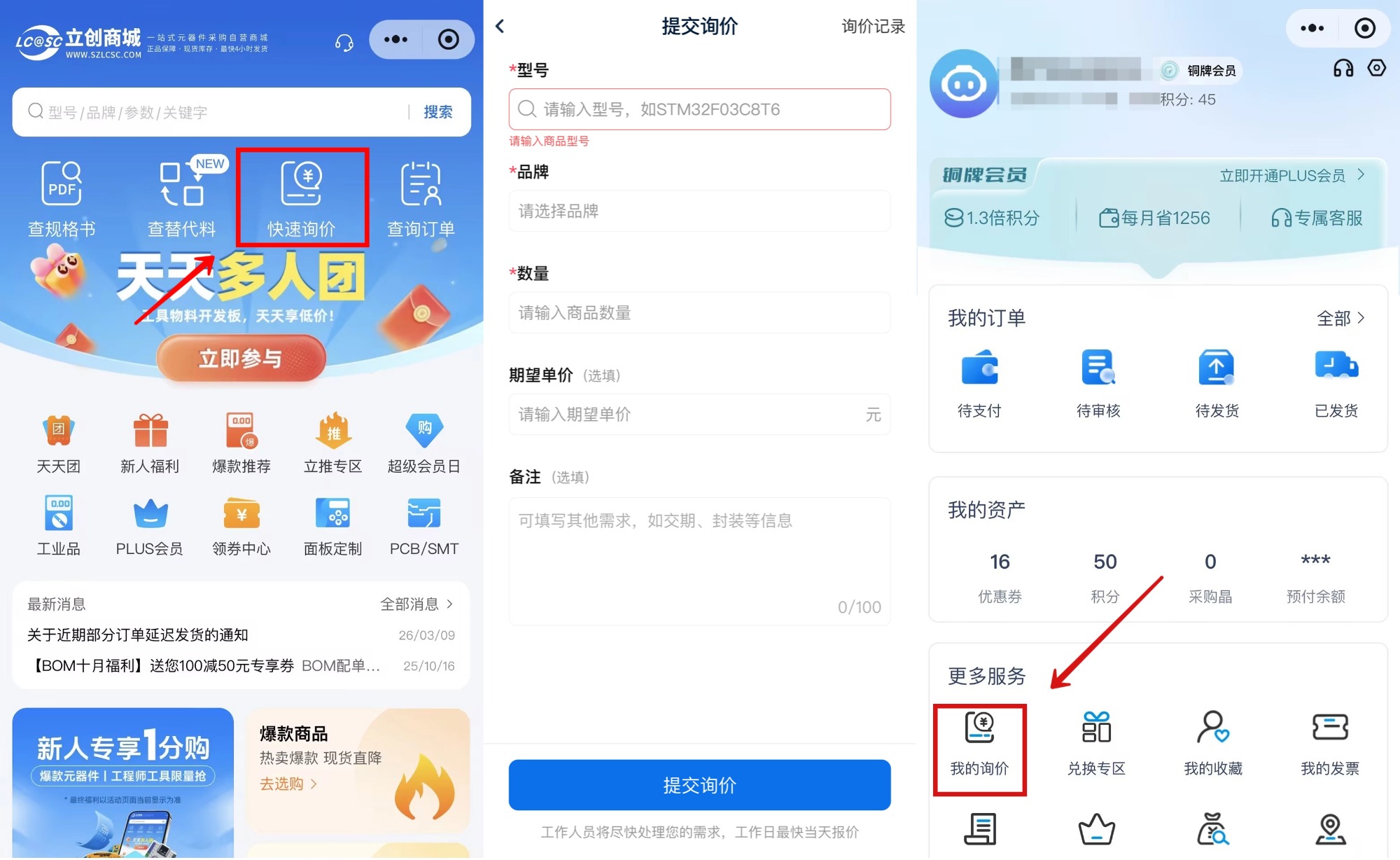 以往采购找不到物料时,不少客户常会遇到这些困扰:询价入口隐蔽、需要反复沟通确认、客服协助才能下单,不仅影响采购效率还易错失采购时机。而本次全新升级前台询价流程,就实现了询价与下单无缝打通,真正做到快捷询价,一键下单: