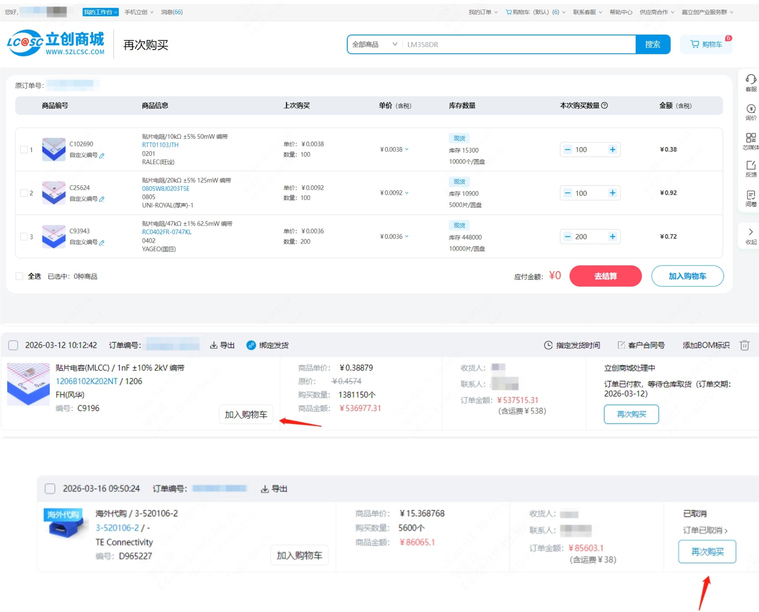 采购复购时,误点全单加购、物料与购物车混淆;海外代购订单取消后无法快速回购,只能逐个重新搜料加购?太崩溃了!现在,立创商城PC端/移动端再次购买功能体验全面升级,极大解决复购痛点: